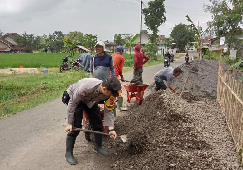 Untuk memberikan dukungan dan semangat kepada warga masyarakat yang sedang bekerja, Bhabinkamtibmas dan Babinsa Desa Sukapada Polsek Pagerageung terjun langsung kelokasi ikut bergotong royong bersama warga meratakan badan jalan dengan batu kerikil yang nantinya akan di rabat beton.