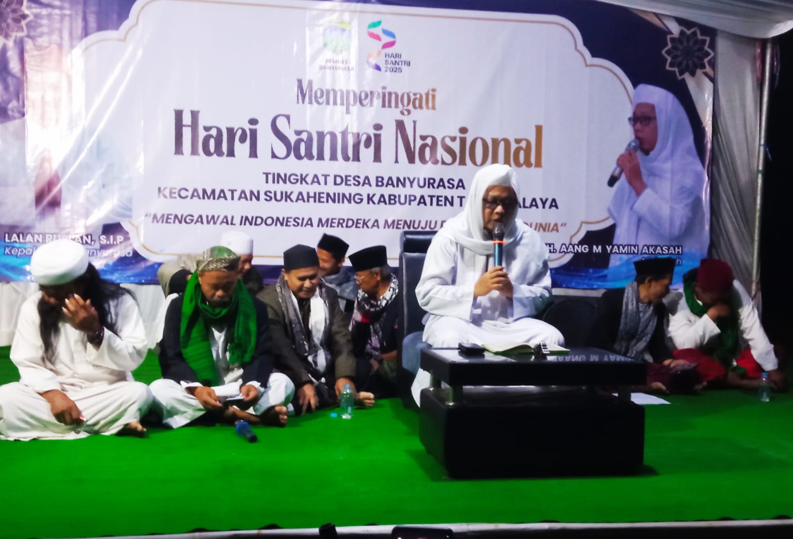 Hal tersebut disampaikan KH. Muhammad Yamin saat menjadi penceramah dan memimpin sholawat dalam rangka memperingati Hari Santri Nasional (HSN) ke-10 tingkat desa, di Lapang Desa Banyurasa, Kecamatan Sukahening, Kabupaten Tasikmalaya, Selasa (21/10/2025) malam.